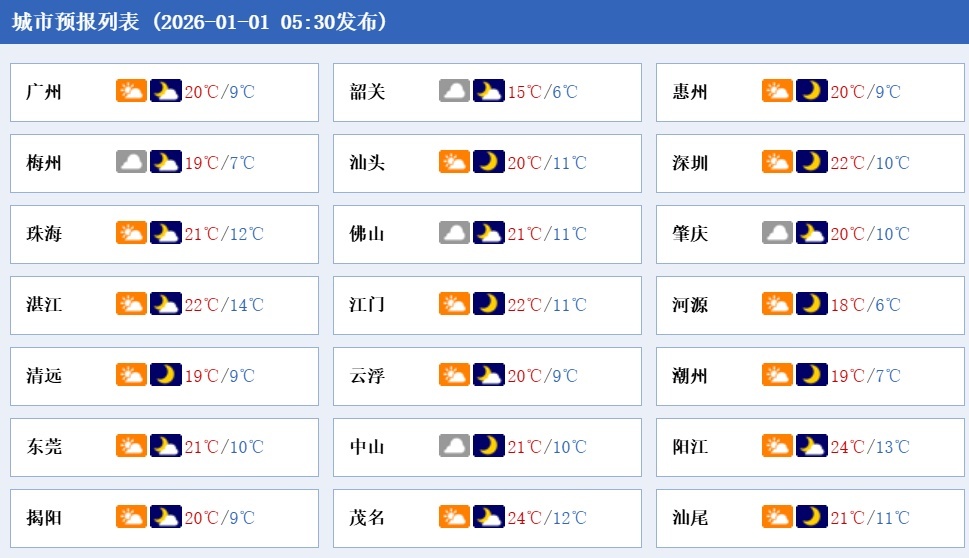 1月1日,粤北市县阴天有小雨,其余市县阴天有分散小雨。最低气温:粤北市县7~11℃,南部沿海市县15~18℃,其余市县12~15℃。